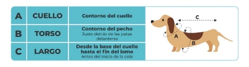 Para elegir el talle correcto, mide el contorno del torso y el largo del lomo de tu mascota y compara con nuestra guía.