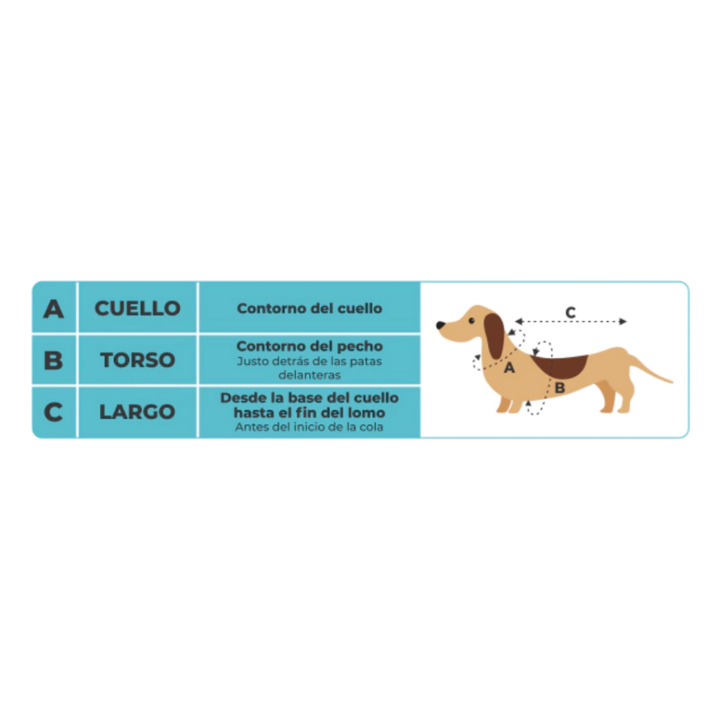 Para elegir el talle correcto, mide el contorno del torso y el largo del lomo de tu mascota.